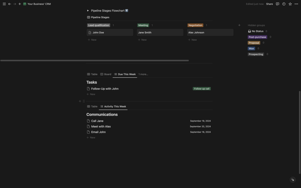 - Pipeline Stages Flowchart: Visualize your sales pipeline with a detailed flowchart featuring stages from Prospecting to Post-Purchase. Easily track your leads' journey and manage your sales process effectively.